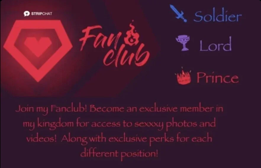 欢迎老公加入我的粉丝团,成为我的王子🤴领主或者士兵吧!爱你们哦💖 希望每天都有你的陪伴,多多互动,多互相了解,让我们每天都充满欢声笑语吧ψ(`∇´)ψ 加入王子粉丝团还有不同的福利哦 💎 点歌免费 💎 小费菜单 折扣 💎 PVT/C2C 折扣 💎 PVT一个月免费偷窥 Welcome everyone to join my fan club, be my Prince🤴Lord🫅 or Soldier🪖 I hope to see all of you everyday, know me more, and be my friends Join as Prince of my fan club, you get : 💎 Free request for songs 💎 Discount for my menu 💎 Discount for PVT / C2C 💎 Free Spying for one month in PVT